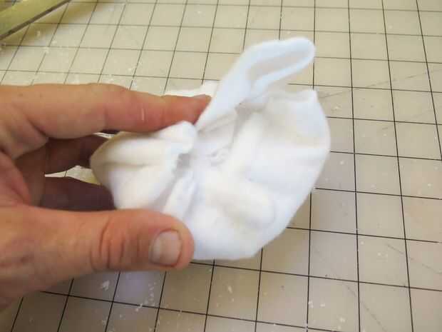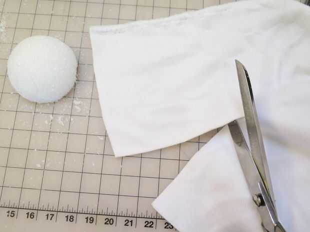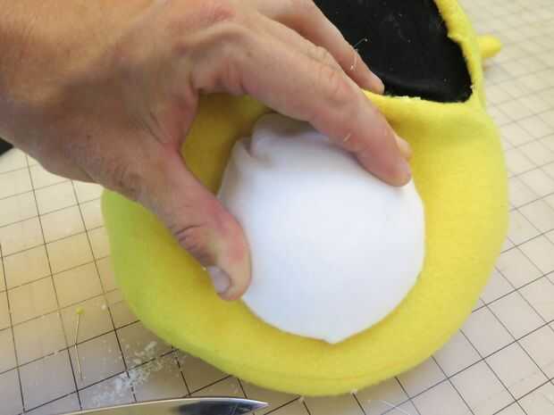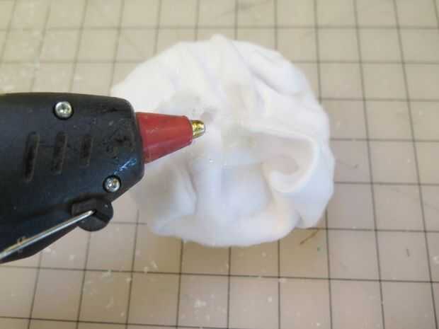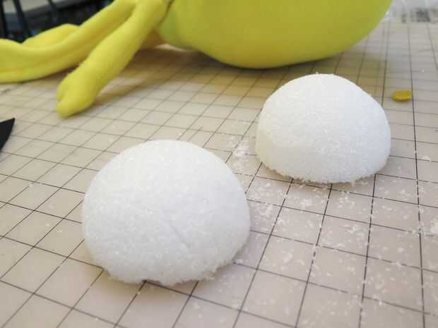 Corte una bola de artesanía de espuma de poliestireno en la mitad y cubierta con lana blanca. Pegue todos juntos para mantenerlo en su lugar, y luego pegar a la cabeza de la marioneta. Usted puede pegar en cualquier tipo de punto negro para la pupila. Puede ser una pegatina, algunos negro papel, o en nuestro caso, un poco de corte de plástico.