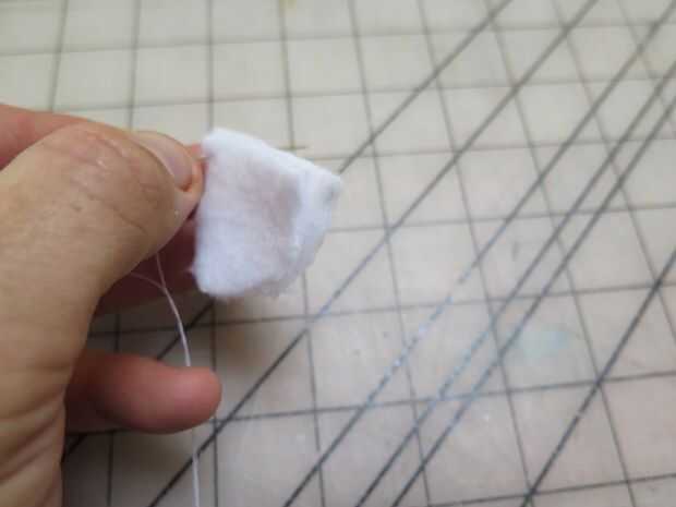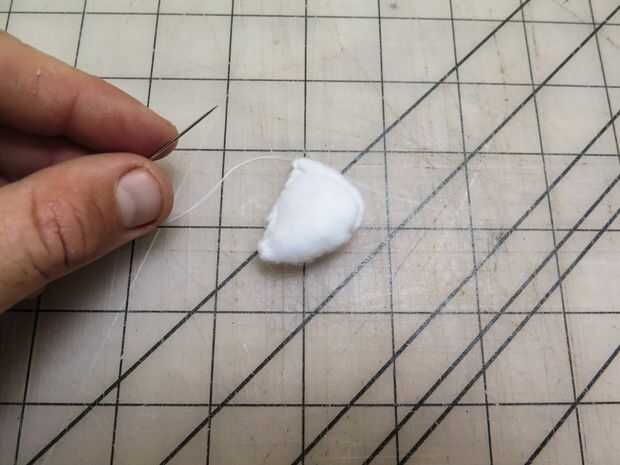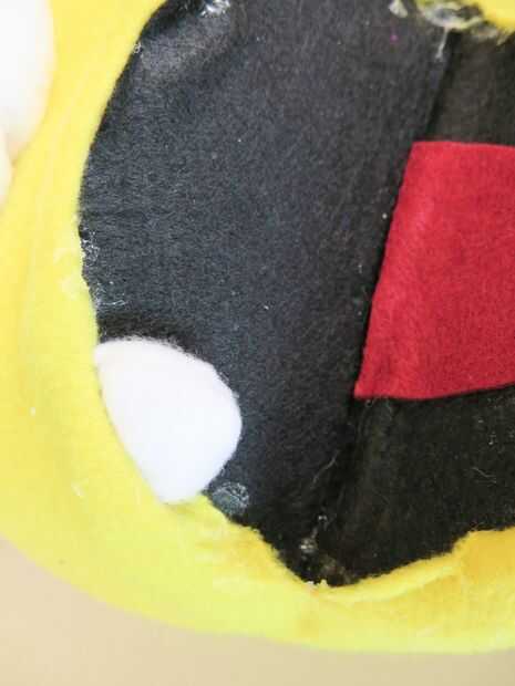 Opcional por supuesto, pero un cíclope debe masticar su comida de alguna manera. Para cada diente, corte una forma similar a la lengua. Coser a lo largo de la curva, dejando la base abierta. Luego tapa Mecharla y coser el diente cerrado. Éstas pueden ser calientes pegados muy fácilmente bajo los labios de la marioneta. Repita para tantos dientes como quieras tu títere que.