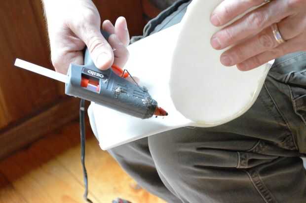 2. Utilice pegamento caliente para pegar los 2 mediados puntos juntos. Esto se asegurará de que tienes las partes del rectángulo centradas. Seguir agregando pegamento caliente hasta que tenga la pieza había pegado a mitad de camino alrededor de la boca. Este es el comienzo de la cabeza!