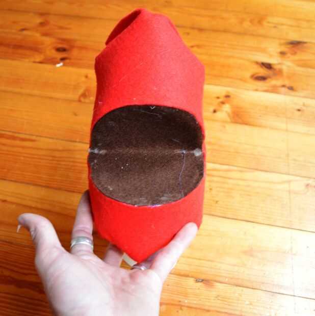 1. en primer lugar hicimos la boca. Coloque el fieltro en la boca y corte a lo largo de los bordes. Es probablemente mejor usar pegamento artesanal que mantenga en su lugar y luego añadir algunos pegamento caliente alrededor de los bordes para asegurarlo hacia abajo.