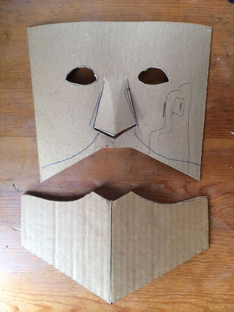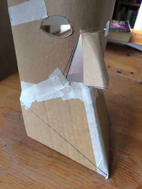 El formulario está hecho de cartón y muy simple. Cortar una pieza lo suficientemente grande como para caber sobre la cara superior cuando se curva. Corte agujeros para los ojos (puede ajustar estos más adelante) y una aleta de la nariz. El labio de gran tamaño es un poco más complicado, y creo que es más fácil adivinar en él y seguir recortando hasta que encaje. El labio le ayudará a mantener la curva de las piezas de la cara. Uso de cinta, este es un proceso bastante indulgente. No estoy proporcionando una plantilla porque cara de todo el mundo es diferente, pero usted consigue la idea.