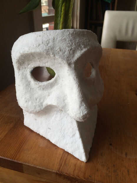 Arcilla de papel maché es fácil de usar que el papel maché y se seca liso y duro. La receta que utilicé fue inventada por Jonni bueno y está disponible (¡ gratis!) en su excelente página web, www.ultimatepapermache.com. Cubrir la máscara con una capa de la arcilla y forma los detalles como los párpados y la nariz. (Antes de que hice esto hace los ojos más grandes y recortar un poco el labio).