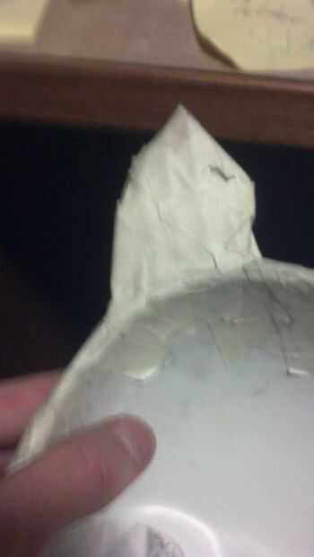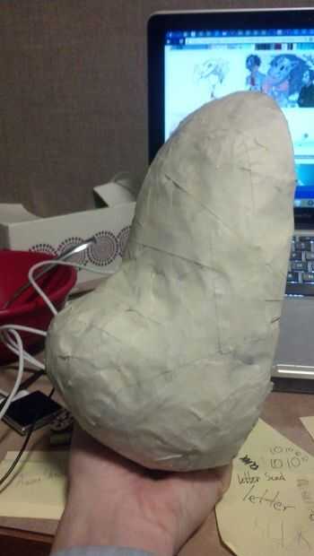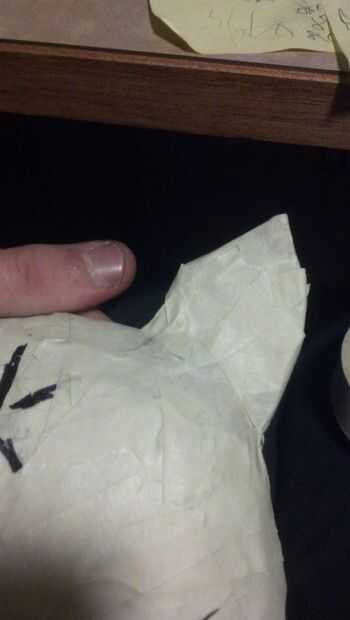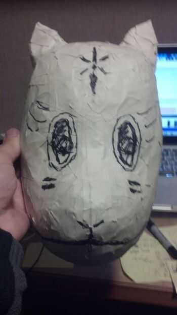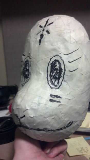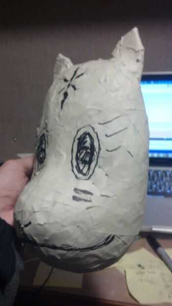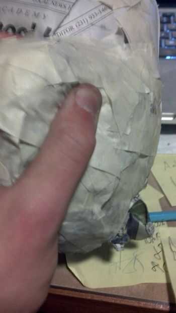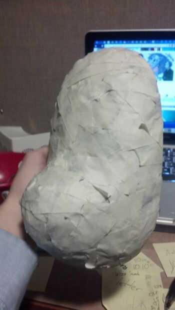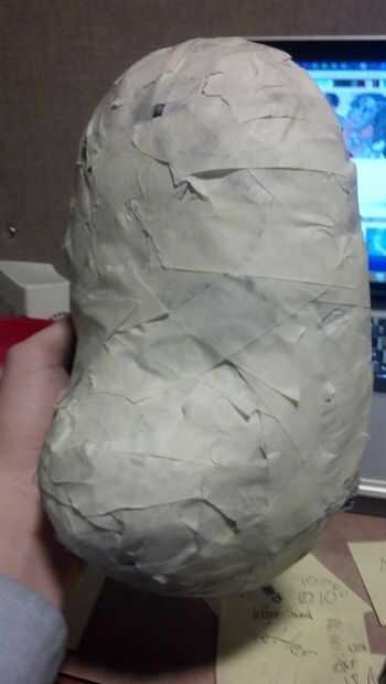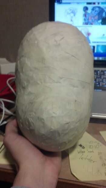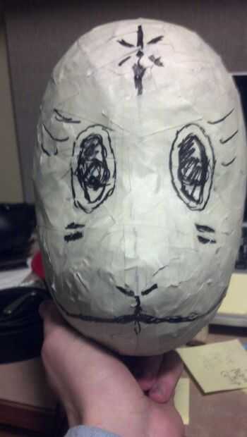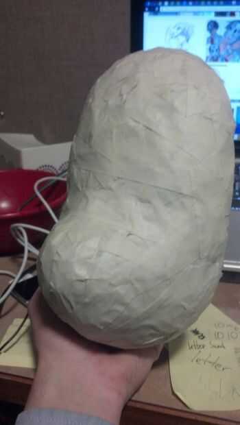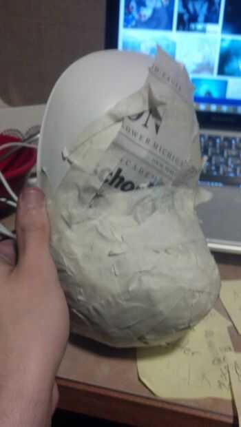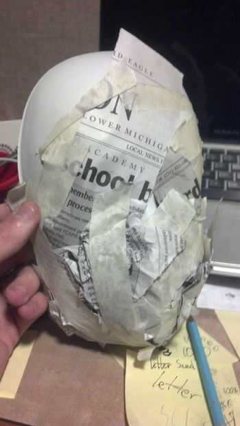 Ahora, para el primer paso que necesita una máscara barata de estireno. Yo tengo a michaels la mía por unos $4. También necesita un montón de cinta adhesiva blanca y periódico. Básicamente, tomar el periódico, crujir en bolas y cinta en la máscara. Sólo manteniendo añadiendo más y más hasta que la forma es cómo la quiere.