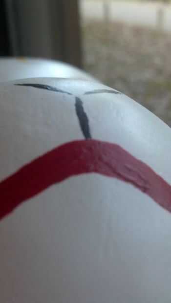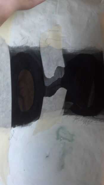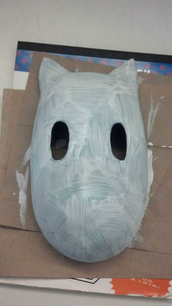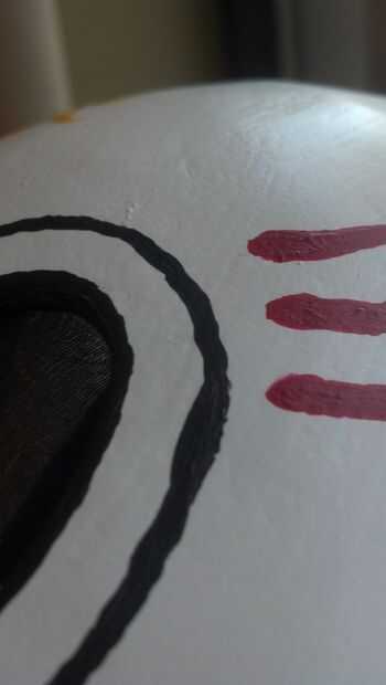 Es el momento de pintar! Lo siento realmente, pero realmente no tomar muchas imágenes durante este paso, pero cómo este paso variará bastante un poco de máscara a máscara. Básicamente, utiliza algunos gesso para actuar como imprimación (y una capa final de suavizado) mientras está lijando entre (el gesso no es realmente necesario, pero si lo tienes en mano) y a continuación todo con pintura en aerosol blanco mate. Después de eso había pintado en todas las características poco con pintura acrílica y había sellado todo con fijador mate (aunque parece tener un poco de brillo). También, estas son solo pequeñas cosas, así que creo que no necesitan su propio paso, pero he añadido un pequeño gancho con hilo para actuar como la correa para sujetar la máscara en su lugar (si tiene elástico, recomiendo que) y grabó algunos fina tela negra detrás de los ojos para hacer que se parezca más a la película.