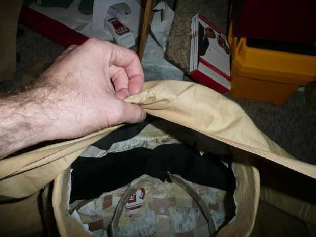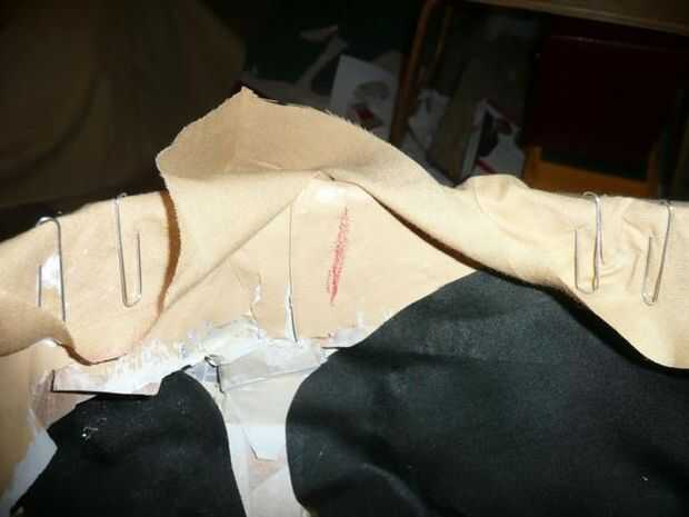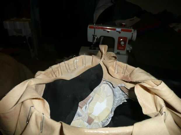 A continuación, invierta la máscara por lo que es el orificio principal. Coloque a la tela sobre el agujero para que las esquinas están apuntando hacia adelante, atrás, izquierda y derecha. Tomar el borde del agujero cortar en la tela y alinéelo con la parte delantera de la llanta de la máscara. Doble sobre y péguelo en el interior de la máscara.