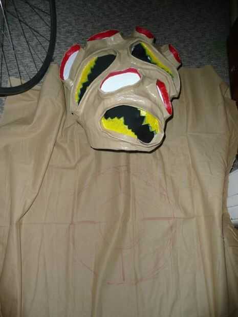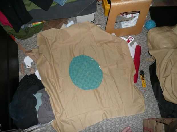 En primer lugar, le cortamos un agujero en el centro de la yarda del resto de la tela que es casi tan amplia como la máscara en sí (más grande que el agujero de la cabeza).