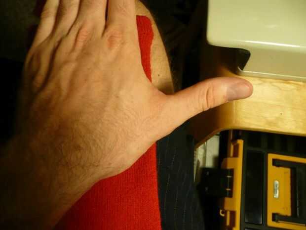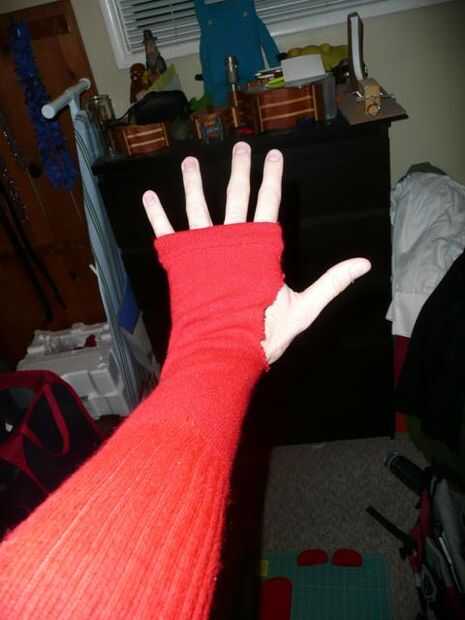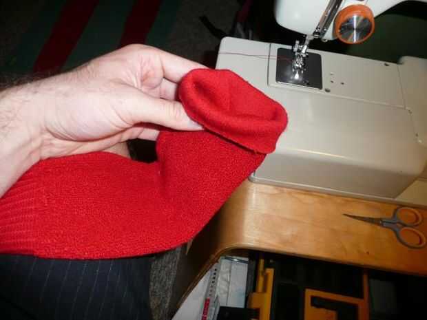 Coloque su mano sobre el calcetín, colocado de modo que el extremo dobladillado pega más allá de tus nudillos. Marcar y corte un raja/agujero del pulgar en el lado. Coser esto arriba similar a la del orificio del cuello para que no se puede desentrañar el calcetín.