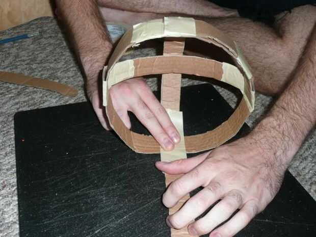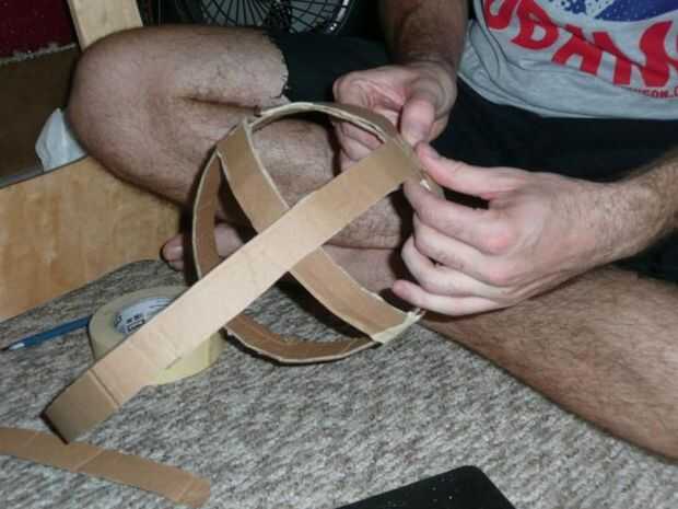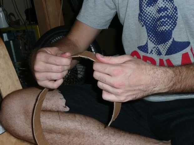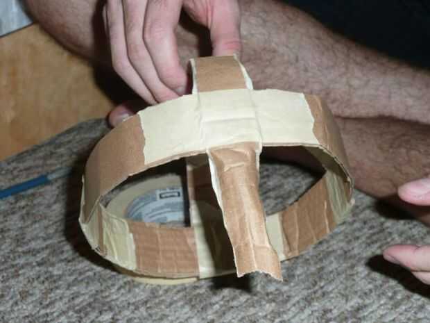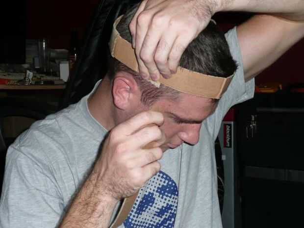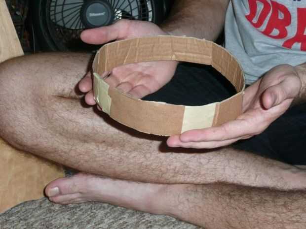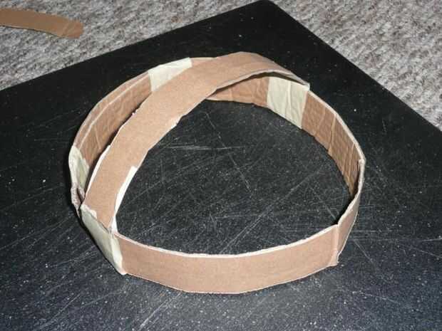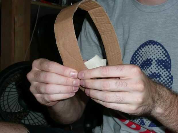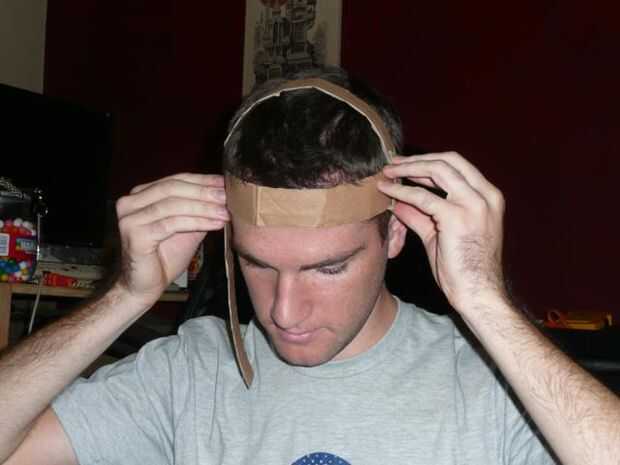 El final de una nueva tira para el lado del anillo que acaba de hacer la cinta. Colocar en la cabeza y doblar que la tira sobre su cabeza para que el anillo está en su frente. Rasgar la cinta y exceso en.