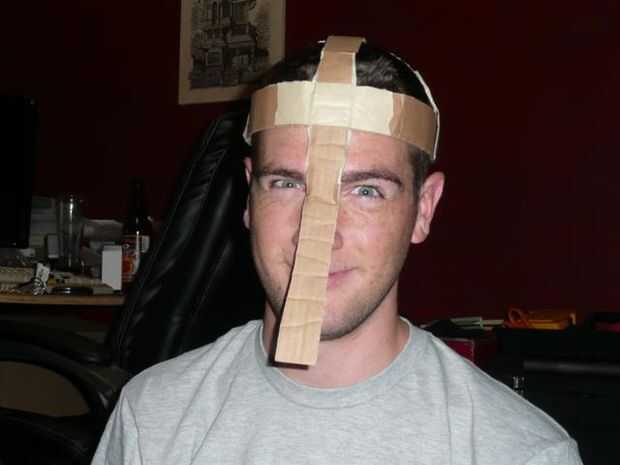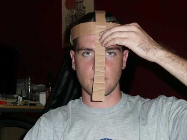 Repetir el mismo proceso con otra tira, pero regresar al frente. Sin embargo, no corte al hilo la parte sobrante. Esta máscara se ser que necesitan una tira sobre la nariz de todos modos. Cuando haya terminado, sonreír como un idiota y sigue adelante.