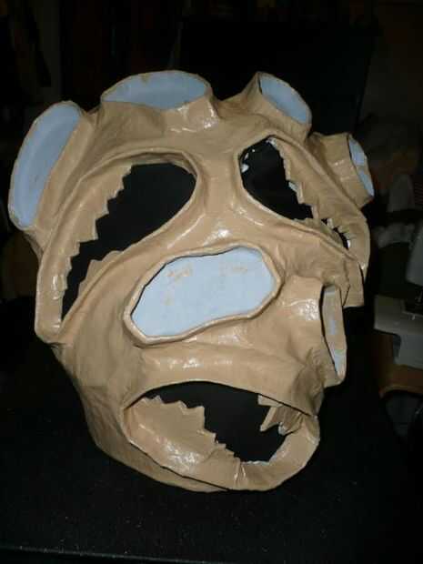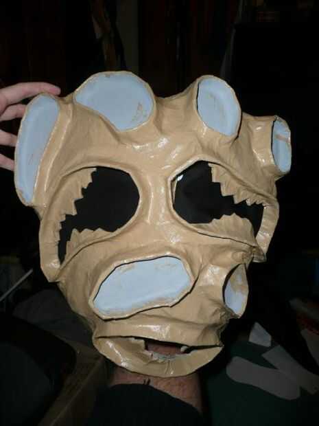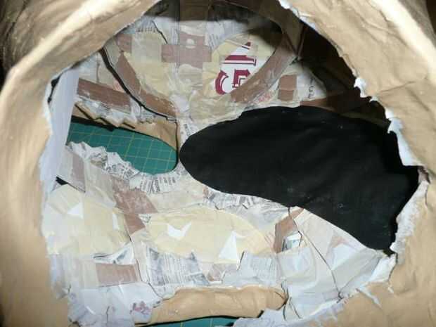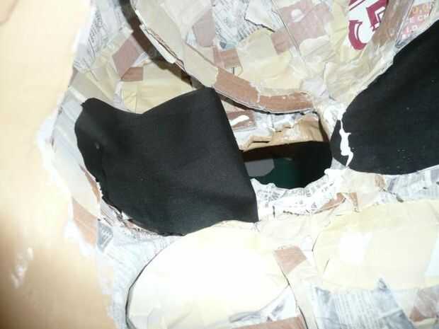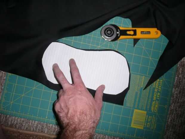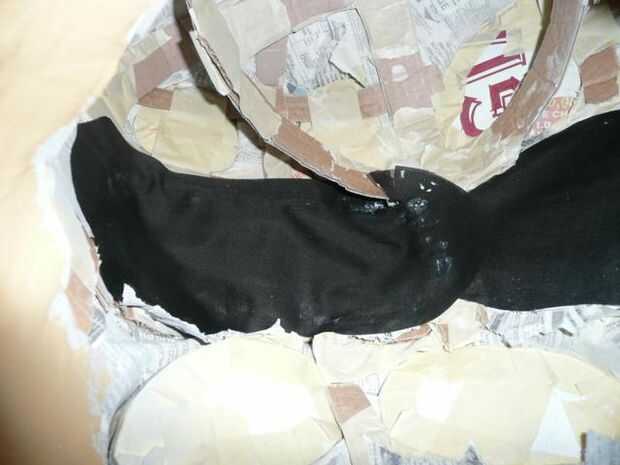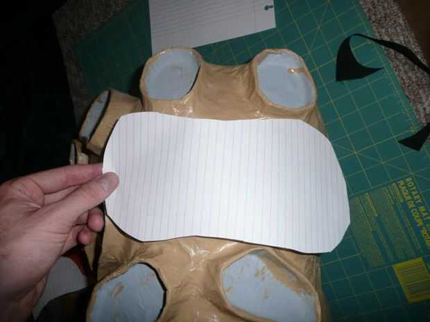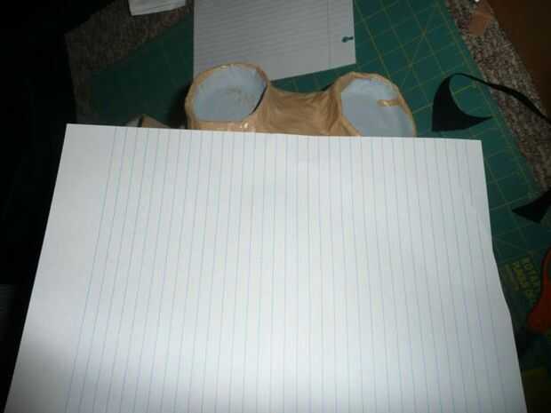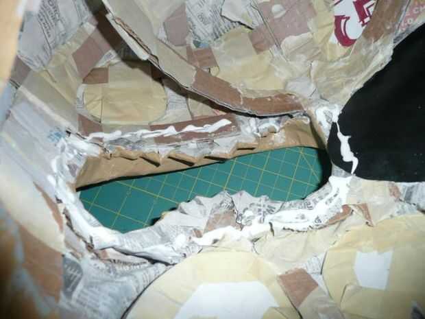 Doblar a la tela de su boca por la mitad y coloque dentro de la máscara. Desplegarlo y presione el borde en todo el pegamento. Puede quitar las costillas que están en tu camino en este punto, a excepción de la corona.