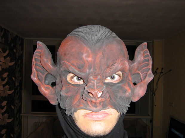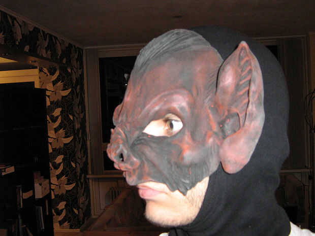 Aquí usted puede ver que la mayor parte de los detalles para mi máscara provenía de un grande, goma Media máscara látex demonio cuernos. En una etapa posterior, quité las orejas de la semimáscara y había colocado en un lugar más realista en la máscara.