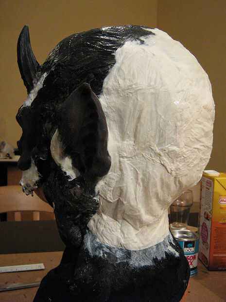 Este también es el paso donde el maniquí cabeza entra en juego; se coloca la máscara en progreso en él. Como dije, este paso puede tomar varios días. Se almacenan en la cabeza evitará deformaciones indebidas mientras las ganancias de máscaras en capas y por lo tanto fuerza. Si haces este paso con la máscara en un molde 'genérico', es totalmente posible que el resultado final será demasiado grande o demasiado pequeño para la cabeza.