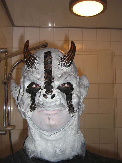 El paso final es pintar la máscara. Dependiendo de qué tipo de máscara que desea y qué tipo de detalle que quieras, vas a tener que romper varios tipos de pinceles. Aquí, he utilizado dos; un grande de la piel, warpaint ojo y y una pequeña para los detalles finos en los cuernos.