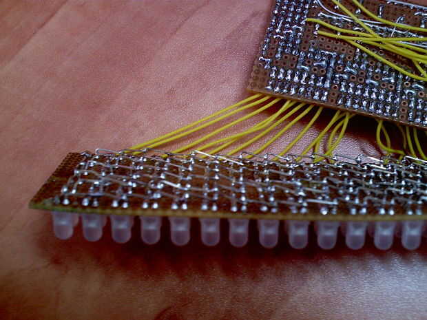 Ahora los cables negativos están conectados en una columna y que hacen soldadura difícil porque las filas positivas están en el camino, así que usted necesitan hacer un 90 grados de la curva con la negativa de plomo y hacer un puente sobre la fila positiva al siguiente negativa el conductor, y así sucesivamente el LED siguiente.
