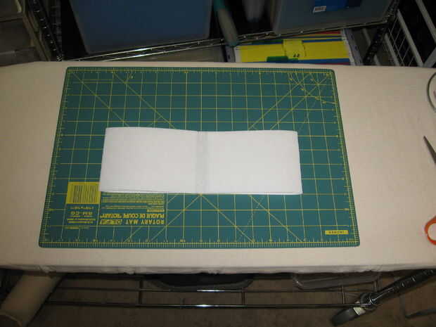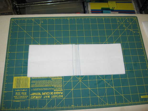 Contar el número de divisores de la caja de mecha. Usted tendrá que construir 1/2 este número de segmentos de tela. Entretela de corte en tiras 4 o 5 pulgadas de ancho. Corte tiras en longitudes de aproximadamente 4 veces la altura de la caja de mecha, menos 1/2 pulgada. Para la construcción de cada segmento, junte 2 tiras y en la parte superior, coloque una marca de 1/4" a cada lado del centro. Un marcador de la tela con tinta soluble o desaparición de agua funciona bien para esto. Doblar cada extremo para las marcas y coser en su lugar cerca del centro. No sé si es realmente necesario, pero lavar y secar mis segmentos de tela antes de usar.