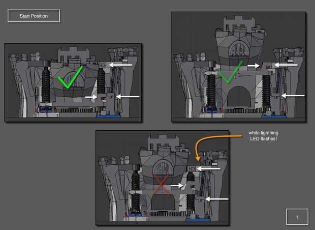 1) después de que carga en el código, al encender tu Arduino lo espera la placa de elevación o estar alineada con la parte superior o el sensor de la parte inferior (esto es cómo calibra el sensor). Si está en algún lugar en el centro de que tu castillo se colgará en el error. Usted sabrá esto porque el relámpago blanco LED comenzará a parpadear en un apagado. Si esto sucede, alinee el sensor y reset Arduino (usando el botón reset). También asegúrese de que no hay nada bloqueando el sensor de puerta/LED