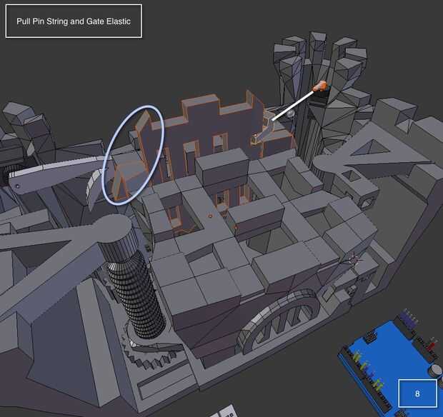 8) último pero no menos importante, utilizar hilo dental para el pasador de halar el brazo de servo pin de pull. También cadena de elásticos de los ganchos de Den of Evil (pega en) y los ganchos en la parte superior de la puerta. Realmente sólo puede tener un elástico en el lado opuesto del perno de tirón de la cadena. No hacer demasiado apretado, no queremos cortarles la cola del ratón! También, si el pin no sacar fácilmente, se puede usar un poco de aceite de aquí.