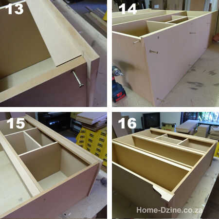 14. Fije la parte superior en lugar de atornillar por la parte superior en la unidad de estante centro, lados y panel frontal.