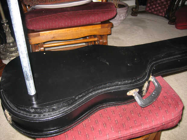 que necesitaba una base acanalada para sujetar las piernas y refuerzo para el caso, así que corte un trozo de tablero de mdf de 3/4" de menor en el caso de la guitarra. Entonces, desde el interior de la caja había jodido el caso para el tablero del mdf.