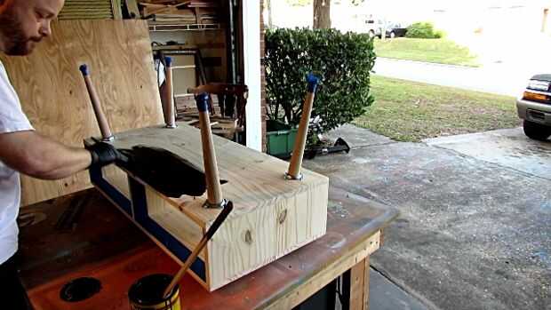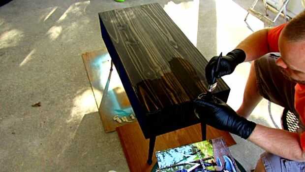 Aplique el tinte. Estoy utilizando una mancha de base de aceite cera Min jacobeo, pero puede cambiar a cualquier color que te gusta. Permitir que la mancha a reposar unos 10-15 minutos y luego limpie el exceso.
