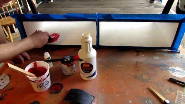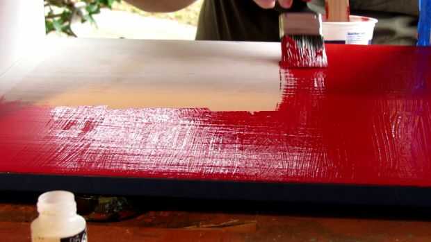 No es necesario, pero estoy aplicando una capa de imprimación antes de pintar para no tener que utilizar múltiples capas. Después de que se seque, aplicar mi pintura. Estoy usando una Valspar lustre cerezo rojo de látex. También estoy agregando un poco de un producto llamado Floetrol para ayudar a eliminar cualquier marcas de pincel a la izquierda. No es necesario usarlo, pero mejorará su aspecto. Como con la aplicación de poli, si uso mucho incluso alimenta al aplicar la pintura.