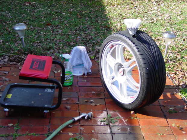 Mientras estás esperando la pintura en la base para limpiar en seco las ruedas muy bien. Necesita obtener toda la suciedad, alquitrán, polvo, grava y productos de brillo del neumático de las ruedas de freno, flancos del neumático y la pisada. No quieres tener nada allí que va a oler o ensuciarse, el piso o los muebles después de traerlo de la casa. Utiliza Simple Green con un cepillo y un trapo para limpiar minas. Apártelas para secar.
