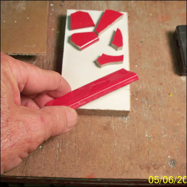 Mientras rompiendo mis tejas rojas separado todas las piezas de borde ya que estos se redondean más y se utilizará en el borde exterior de mi mesa. Esto le dará un acabado más profesional y ningún tratamiento será necesario.
