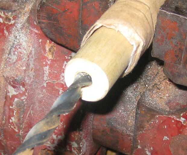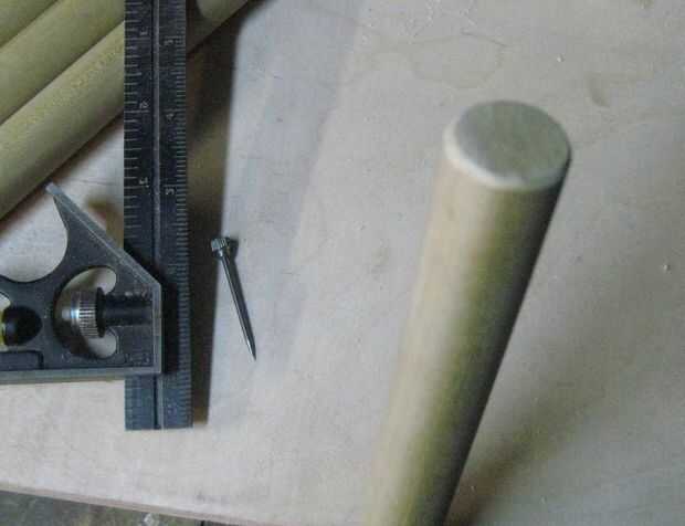 Con un borde recto y un escribano, marque uno de los extremos de cada espiga en el centro. Sujete la clavija en un tornillo de banco y perfore un orificio de 5/16" 1" de profundidad en el extremo. Nota el cartón envuelto alrededor de la madera para protegerla de las mordazas.