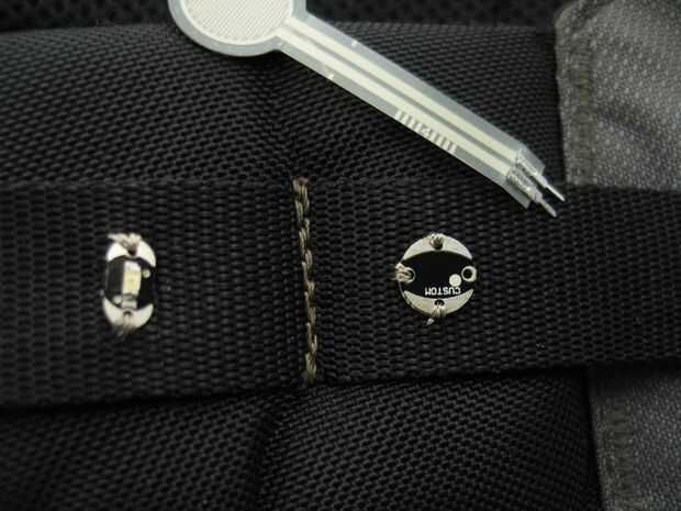 Ahora es el momento para conectar el sensor de fuerza. Este tipo tiene menos resistencia, más presión se aplica a él. Elegir un lugar donde es probable que la presión de la mayoría cuando lleva su bolsa. Más grueso es el bolso, más presión en este lugar. Conectar las dos clavijas en el sensor de fuerza en los orificios laterales del tablero sensor de encargo. No importa que uno va donde. Una vez cosido en, puede adjuntar la broca irritar a la almohadilla soulder. Reprogramar el uso de la interfaz de schemer para obtener la respuesta deseada. Ver el video en la parte superior de la página, o ir a la