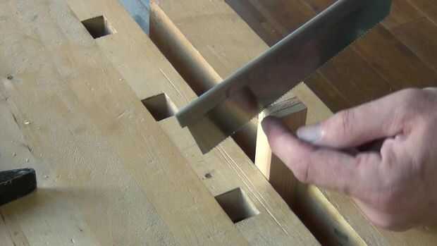 Vi las líneas de la mejilla de espiga dejado por el calibre, manteniendo el corte (vacío dejado por la sierra al cortar) en el lado inútil de las líneas.