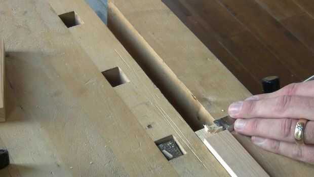 Esto se remedia fácilmente pelado de las caras de la espiga con un formón ancho, o usando un hombro plano o plano de router. Usted debe estar seguro primero pare hacia abajo a las líneas de calibrado en cada cara y entonces pare igual de cada cara hasta que la espiga quede.