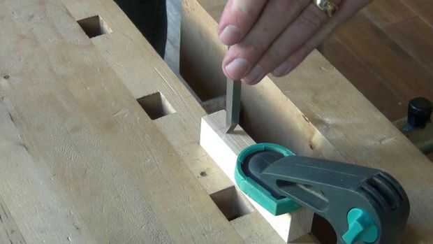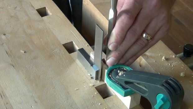 Ahora los extremos de la mortaja se cortan nuevamente a las líneas de cuchillo, con cortes ligeros para evitar que se muevan de la línea (esto puede suceder porque el bisel sobre el cincel que actúan sobre los residuos, convierte parte de la fuerza hacia abajo en una fuerza horizontal hacia el final de la mortaja). Estos cortes deben ser perfectamente verticales cuando que se llega al final, y un cartabón se sentó junto a la obra ayudará a guiarlo.