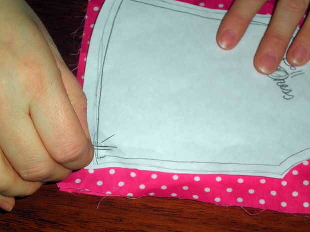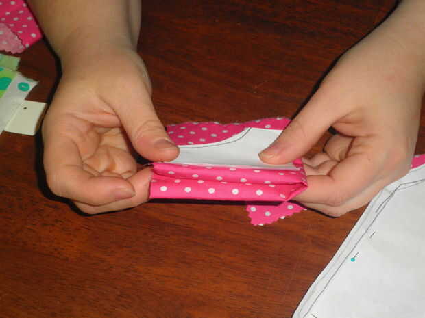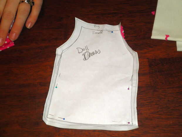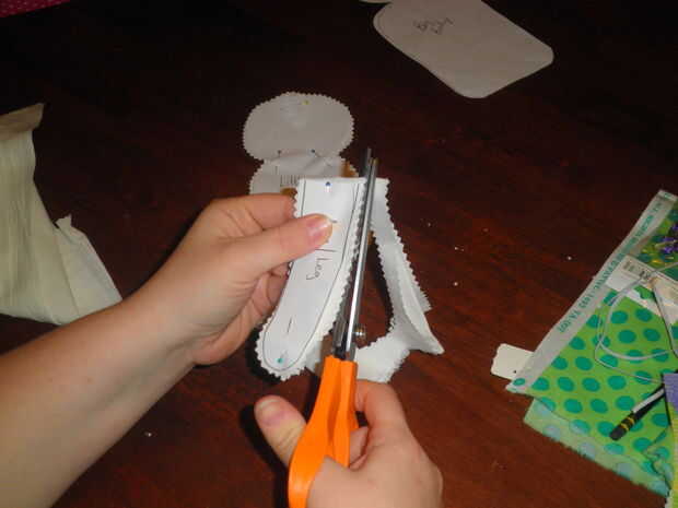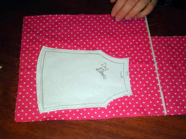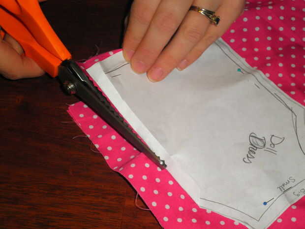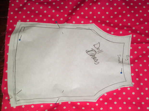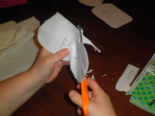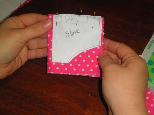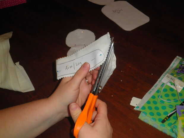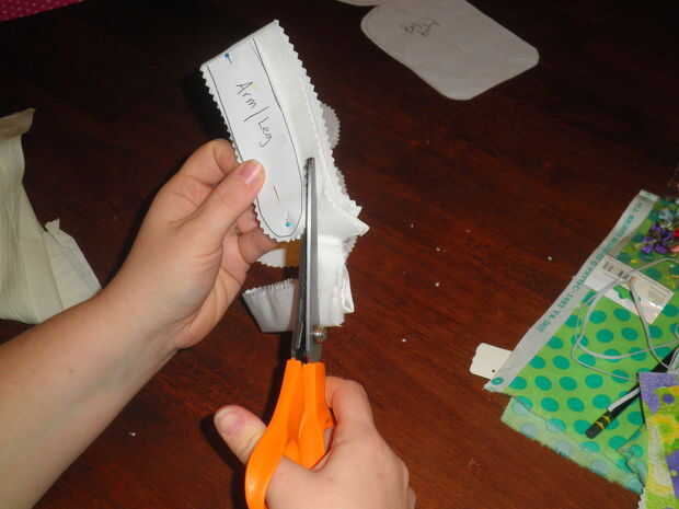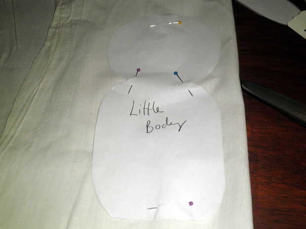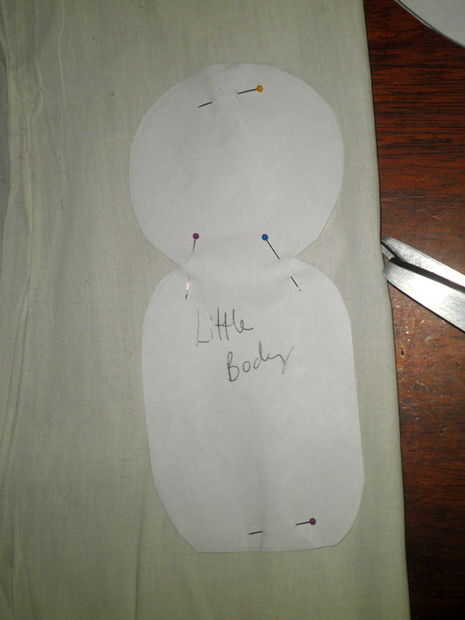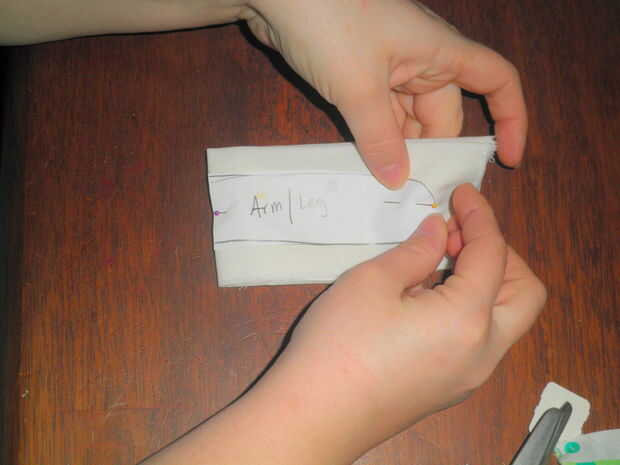Cut out the paper pattern. Tome la tela que vas a usar para el cuerpo y doblar por la mitad. Pin el patrón de papel a la tela que vas a usar para el cuerpo. Corte la tela a lo largo del patrón. Pin el patrón para el brazo/pierna de la misma manera que hizo el cuerpo y recórtalo. Se necesitan cuatro de éstos. Dos brazos y dos piernas.