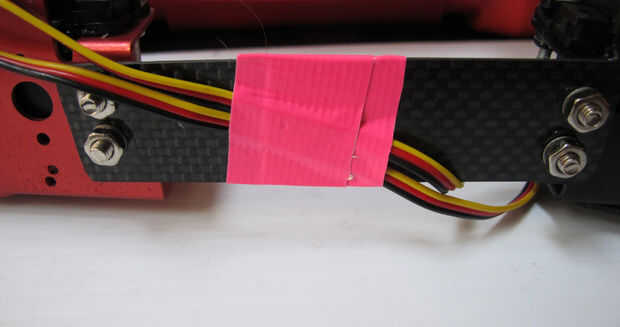 Cadena el hilo hacia abajo alrededor de la parte posterior de la fibra de carbono y con cinta adhesiva a la fibra de carbono para que cuando finalmente puse la piel vacío, no tire de los cables demasiado. También puse cinta en el cruce de cada conexión de los cables para seguridad.