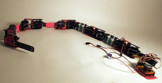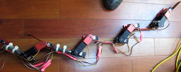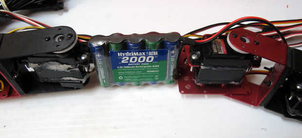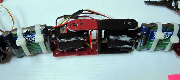 Os adjunto cuatro baterías en total. También utilicé las extensiones de cable de servo para extender la energía de la batería y la tierra al frente de la serpiente, a la cabeza, donde se encuentra el Arduino. Hice un link y en cada cruce de batería por lo que todos ellos confluyen en la energía terminal de tornillo de Arduino y servomotor de tierra de entrada.