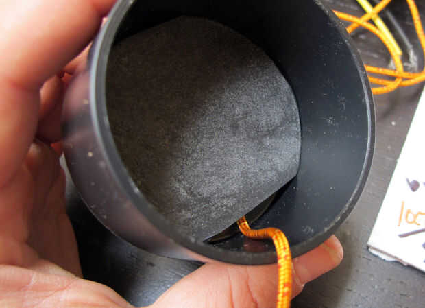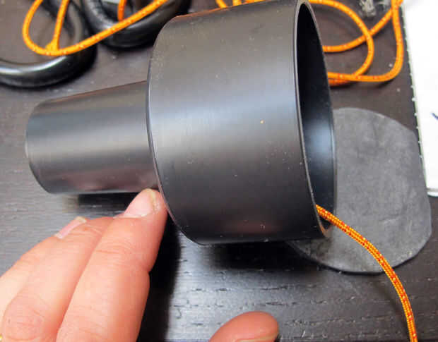 Dos cortar un trozo de goma cerca de 1.75" diámetro, para ello encaja dentro de los reductores de vacío. Cortar dos trozos de cable de unos 2 pies de largo, para actuar como correas y para ayudar a posicionar el cuerpo dentro de la piel.