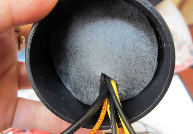 Recorren ambos botones el reductor de vacío. Ejecute el cable (que contienen energía y suelo) de la bomba de agua hacia abajo a través del orificio en el reductor del vacío. En total, los siguientes cables deben ejecutar por el reductor del vacío y el cojín de goma: alimentación y tierra de ambos interruptores; una cadena; alimentación y tierra de la bomba.
