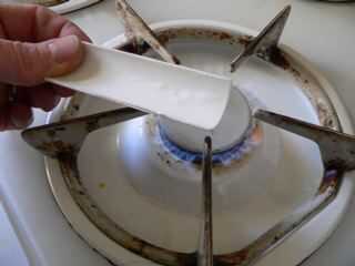 PVC de calor sobre la estufa. No quemarse. Mantenerlo en movimiento siempre. Usted debería poder sólo barly manejarlo a mano. Cuando suave y flexable inserción rápidamente sus dos cuchillas y prensa que en forma hasta que se enfríe.