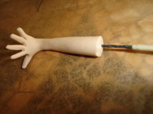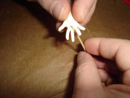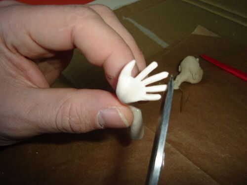 Las manos, un colector del ojo real en esta pieza, pero realmente se hicieron de manera sencilla. Después de rodar una "salchicha" oblicuamente hacia la muñeca, se aplana la "mano". Luego corte los dedos con tijeras. Quinto dedo podría terminar de espesor, pero en ese caso simplemente cortar toda la mano a la posición deseada (imagen siguiente). Dependiendo del resultado elegido qué dedo será el dedo pulgar y cortar un poco más. Cortar los dedos a la longitud deseada y con extensión en el tothpick como se muestra. Doble la mano y los dedos en la posición deseada. Usted puede hacer un pequeño lijado después de la cocción para terminar las manos, pero generalmente mantener a un mínimo. Es un ejemplo clásico de mejor ser enemigo del bien.
