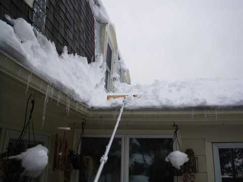 con 30 pulgadas de nieve en el suelo y otro de 12 pulgadas de previsión, quitar la nieve existente de un techo bajo era necesaria para evitar que una presa de hielo costosos y daño interior. Una vieja escoba de tienda, un trozo de madera contrachapada de 3/8", un mango telescópico y unos pies de cable eléctrico calibre 12 transformó una vieja escoba tienda en un rastrillo de nieve eficaz.