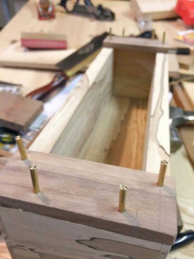 Para la tapa y mecanismo, utilicé nuez para contraste. Por esta razón siempre mantengo mi madera desechos. Estos 4 son thicknessed a 1/2". y empecé a cortar todo antes de pegarlas. Todos los ángulos y puesta a punto se realizó con un avión de la mano. los chips más pequeños realmente hacen la diferencia. Lamentablemente, no tengo una fórmula para este proceso, pero un poco de ensayo y error te ayudará con cualquier tamaño de caja que está haciendo.