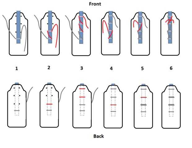 3. Repita el último paso para los siguientes dos conjuntos de orificios. Esto debe dejar con el extremo más largo de la cuerda en la parte inferior agujero más en el lado izquierdo y un extremo más corto de la cuerda en el orificio superior de la mayoría en el lado derecho.