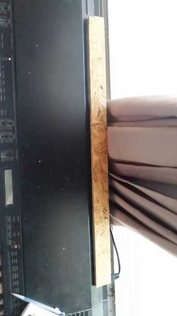 tenía una pieza de contrachapado que era aproximadamente de 1 cm de espesor. era lo suficientemente espesa para poder montar un tornillo de 1/4" a través del medio. La obra fue de 30" de ancho y 11.5" de alto. Había medido la tapa del piano y que fue una buena anchura para que no solapen los altavoces. Corte 1.5" usando una sierra de cinta. Esta izquierda la altura en 10" y también aseguró que la bandeja era de la misma pieza como el forro, así que la madera correspondería con. También tuve otro trozo de madera del mismo grosor, pero cerca de 27" de ancho. Corté dos tiras de 1,5 "x 27" de esto, para apoya a la parte posterior. ya que sería en la parte de atrás, estaba bien que la madera no era tan agradable y era más corta.