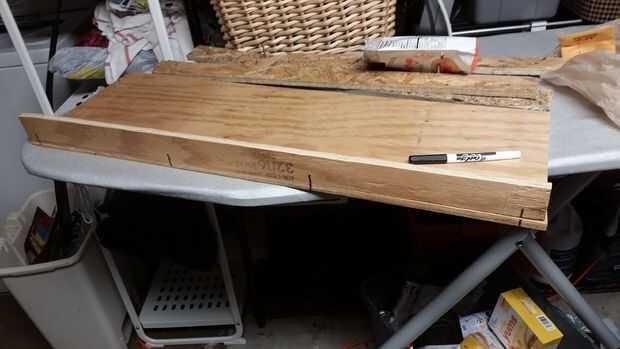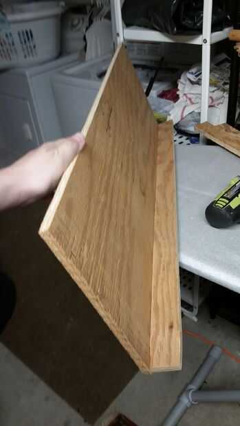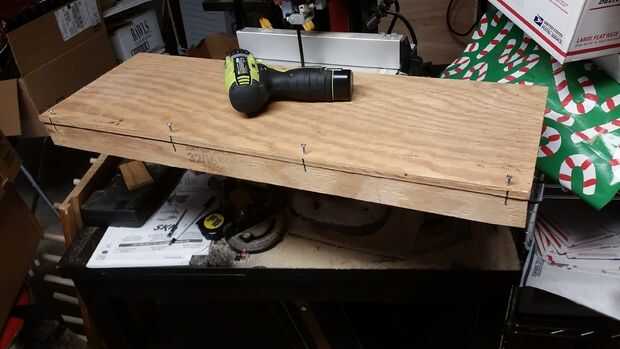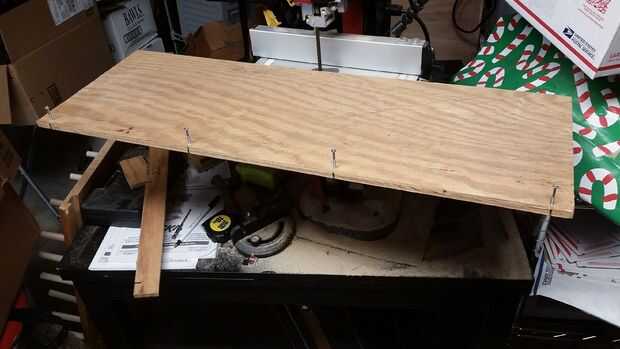 Usé 4 tornillos para madera (1/4" diámetro, cerca de 1.25" de profundo). Taladraron previamente 1/4" agujeros en las marcas, en el borde corto de la bandeja y en la parte posterior del soporte. Los agujeros traseros perforé lo suficientemente alto como para que la parte inferior de la pieza posterior se alinee con la parte inferior de la bandeja.