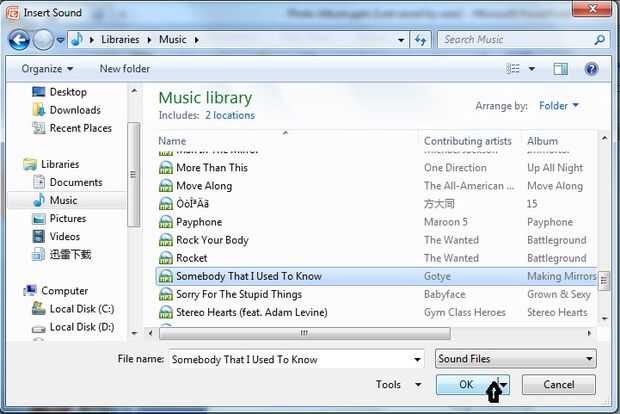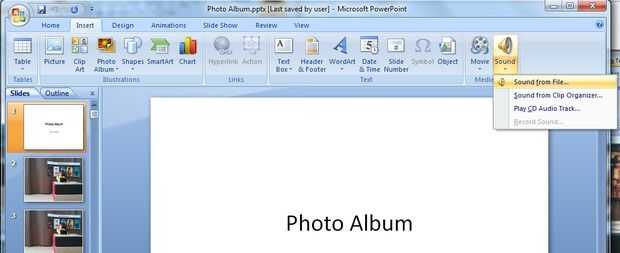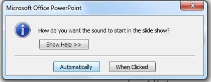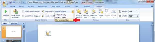 En la parte superior, vaya a "Reproducir sonido" y haga clic en siguiente, haga clic en "Play a través de diapositivas" (esto hará que la canción jugar y no parar cuando cambia fotos)