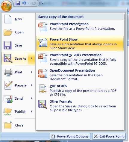 Haga clic en "guardar como" y luego "Powerpoint Show"