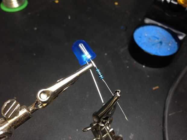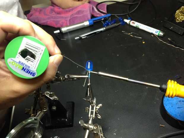 Ayudando a las manos puede ayudar a mantener el LED y el resistor constante como se les de la soldadura. Si estás usando soldadura sin plomo entonces recomendamos uno con contenido alto de plata (Ag).