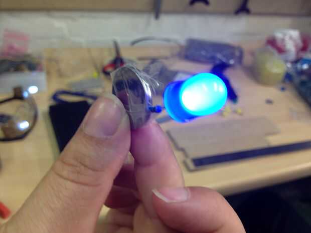Aseguró la batería a las patas del LED usando la cinta adhesiva; no intente soldar la batería ya que puede estallar. Cuando ajuste la batería usted quiere asegurarse de que está completamente contenida para evitar un corto.
