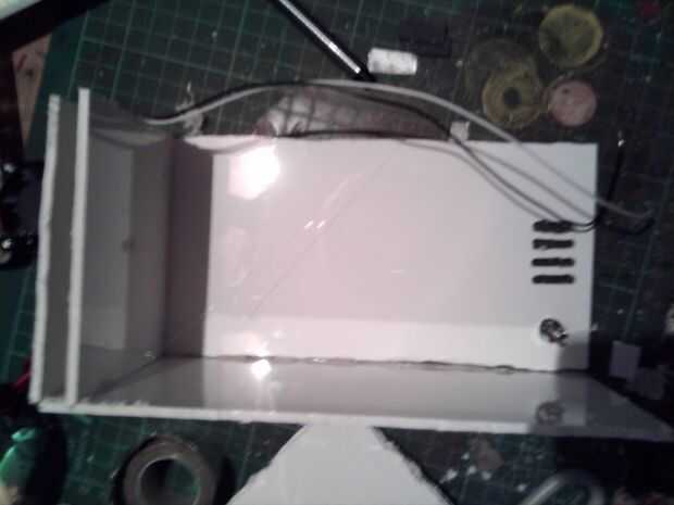 Ahora, puede empezar a trabajar en la captura de luz y magnético de la puerta. Encontrar la pieza de 10x10cm de plástico con un agujero pequeño en la parte superior y pegamento caliente en el LED de la parte superior. Si usted utiliza una tensión más baja LED, ahora la soldadura su resistencia en la pata positiva. Suelde los cables adecuadamente coloreados (rojo positivo, negro para el negativo) al LED (si no has usado LEDs antes, la pata larga es positiva, y pata corta es negativo. También se puede saber por la parte plana pequeña en el redondeado parte inferior de lo LED indica negativo.) Doblar las patas del LED para que sean paralelas con el plástico. Pegue la pieza de 1cmx10cm de plástico el el borde paralelo a los cables, por lo que los cables van a la derecha y hacia arriba la palanca de plástico donde están los cables. Pegar la parte posterior de la pieza de 10 x 10 al panel posterior, 1cm de la tapa (otra vez, esta medida cuidadosamente ambos lados). Asegúrese de que los cables están saliendo de la derecha y 1 de las dos placas de 10 x 10 lisas para la parte superior de la pieza posterior del panel y 1x10cm en la parte delantera del pegamento. Deslice la pieza de 15 x 10 lisa el lado derecho y péguelo 1cm del borde. Doblar los cables hacia abajo a lo largo de esta pieza de plástico. El cable negro en la parte inferior de la curva y soldadura a la negativa de la toma de corriente en el panel posterior. Encuentra tu pieza 15x1cm e inserte el microinterruptor. Asegurar con pegamento caliente. Que tenga que hacer algunas pruebas con un multímetro para determinar la polaridad de la micro. Suelde el cable rojo de la LED al común y otro pedazo de cable rojo a normalmente cerrado. Este derecho alrededor de la parte inferior de la curva y soldadura al positivo de la toma de corriente. Ahora que ha terminado toda la electrónica!