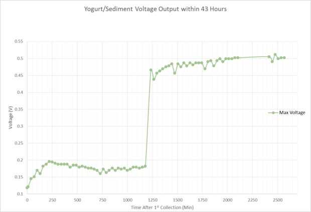 Las lecturas de tensión inicial las primeras 18 horas de funcionamiento MFC fueron entre 0.118 a 0.196. El alto voltaje 0.196 V se alcanzó dentro de 5 horas de comenzar el MFC y luego disminuyó y se estabilizó en las próximas horas 13 de 0.163V a 0.185V. Durante la siguiente hora 15 ejecutar el voltaje MFC dramáticamente aumentó entre 0.466V a 0.505V. Derecho antes de voltajes se tomaron para las segunda ejecución ≈15.5 gramos de glucosa fue añadido a la cámara anaeróbica y revolvió uniformemente en todo el sedimento y el yogur.